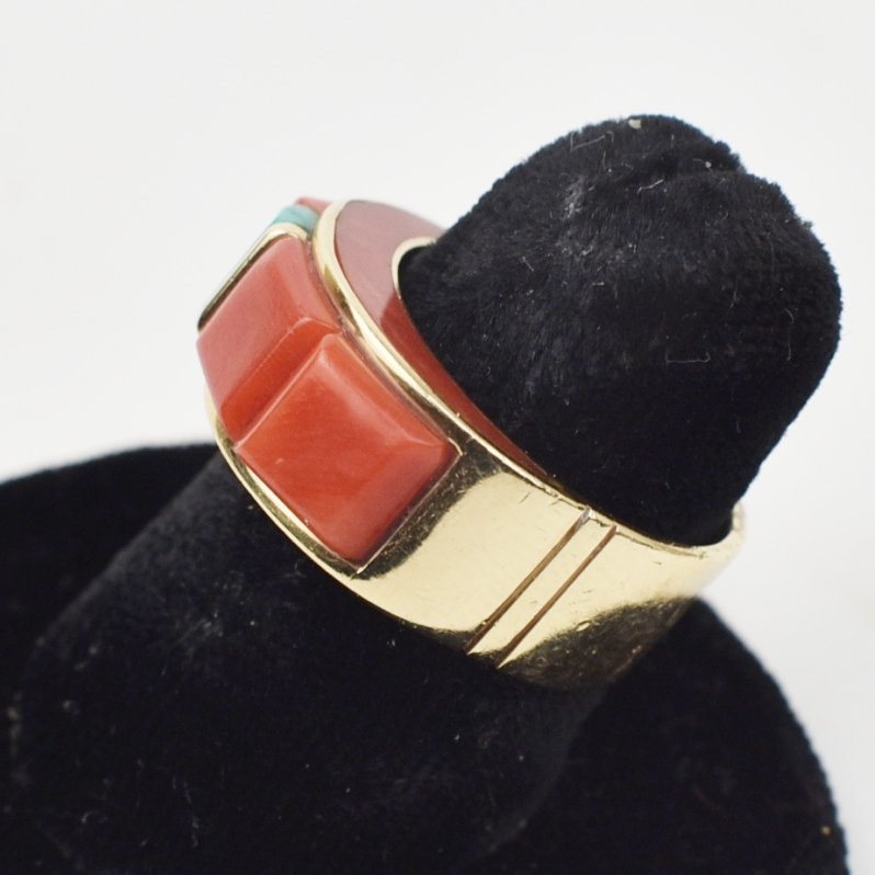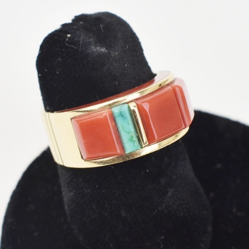 Beck was renowned for introducing side inlay into his rings, and this one has both turquoise and coral inlays on the sides. Hallmarked, size 6 3/4.